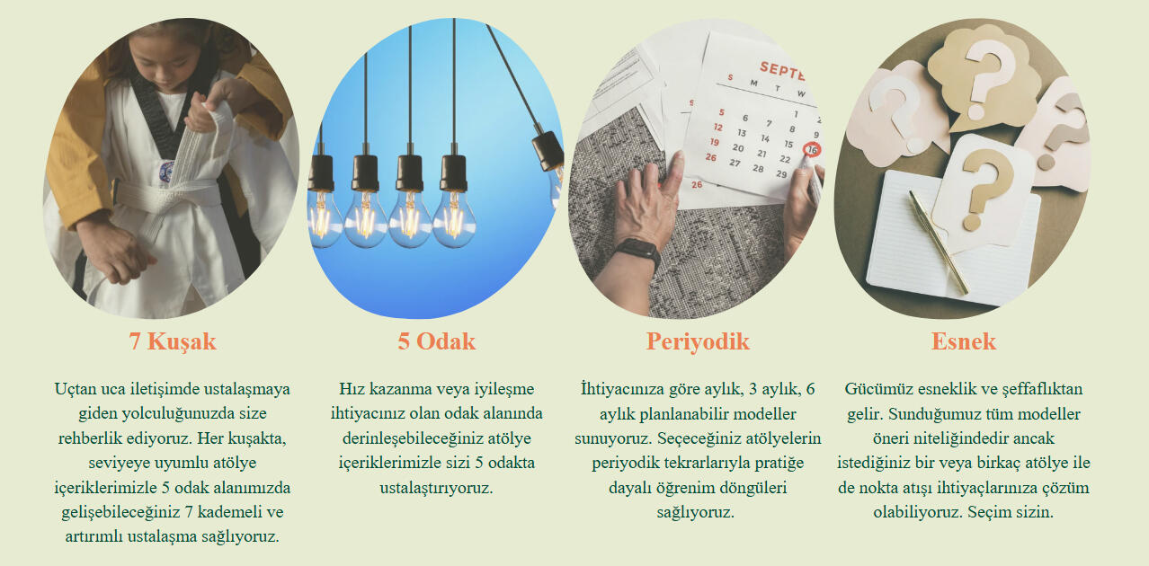 Atölyelerimizle insanı odağa alıyor, iletişimi yalınlaştırıp kolaylaştırıyor ve potansiyelinizi açığa çıkarıyoruz.